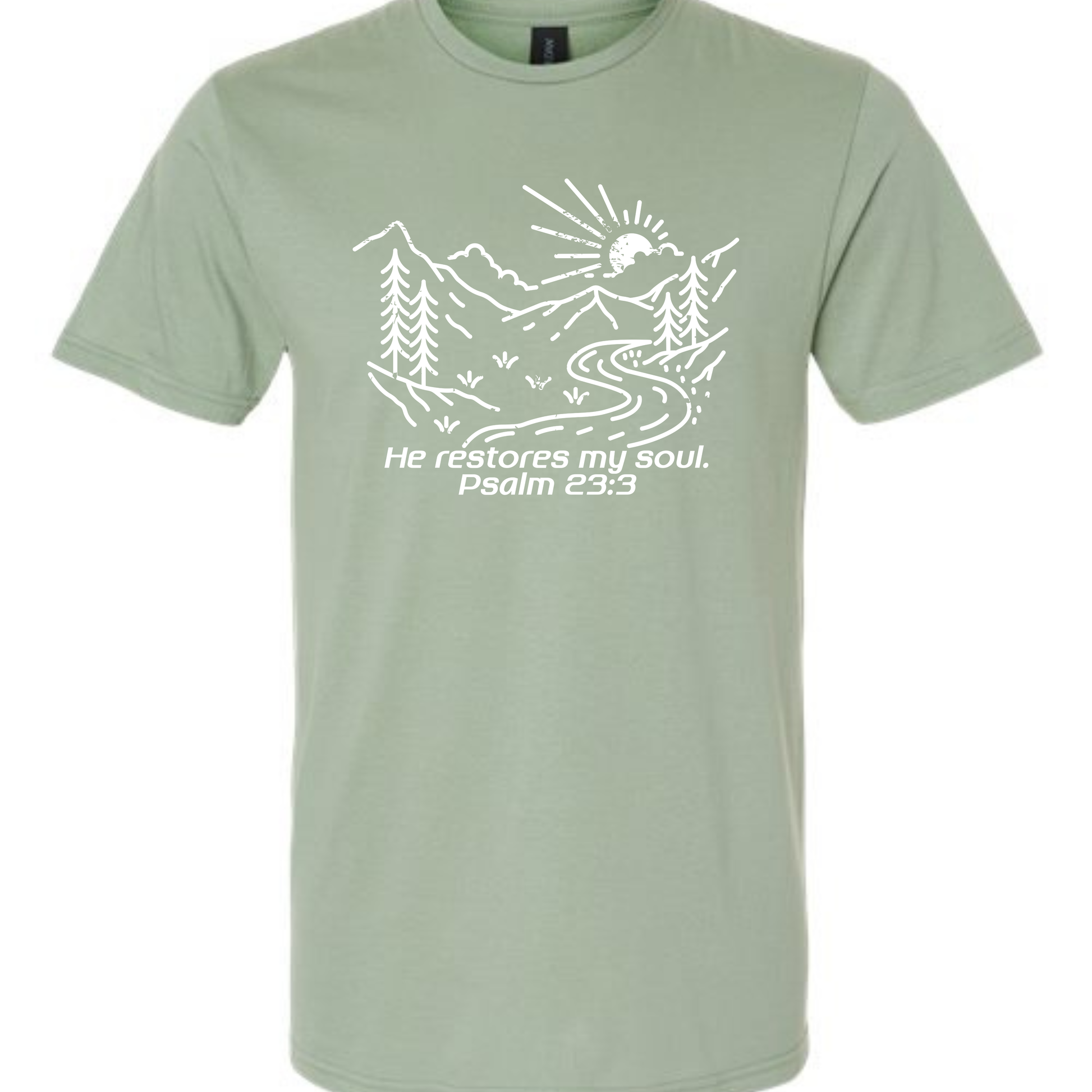 This graphic tee features a peaceful mountain scene with a flowing stream and the verse “He restores my soul. Psalm 23:3.” Soft, calming, and full of meaning — a wearable reminder to find rest and renewal in Him.