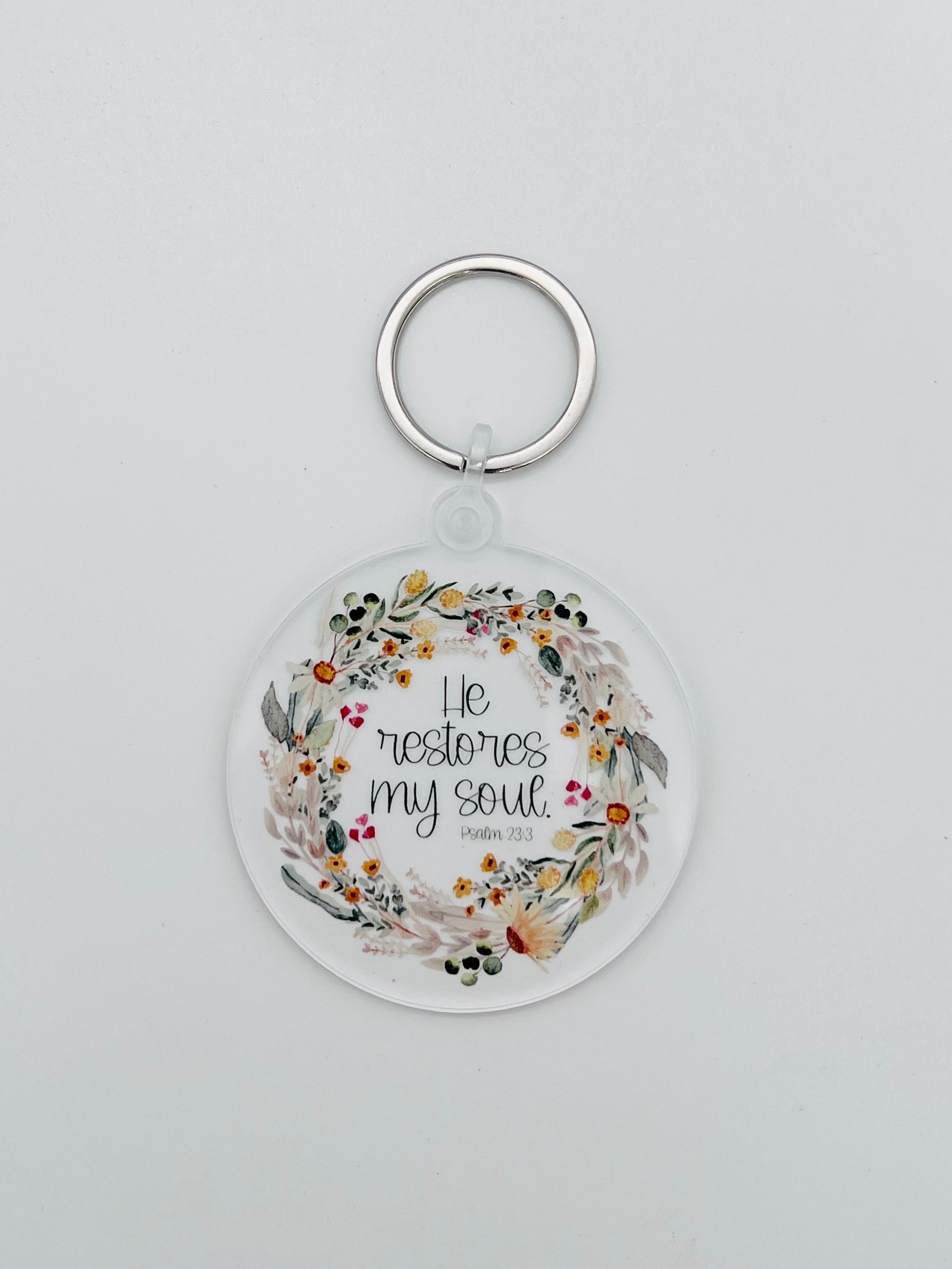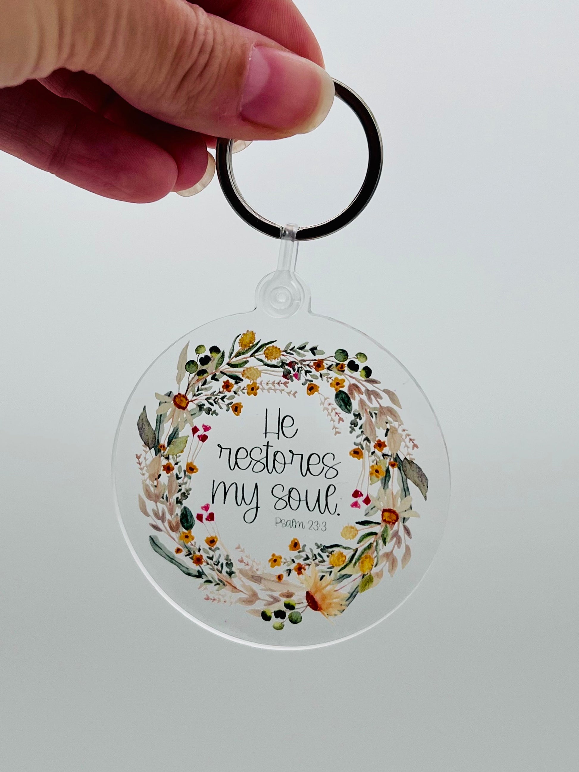 This acrylic keychain features a beautifully detailed floral wreath surrounding the comforting scripture “He restores my soul” — Psalm 23:3. Lightweight, durable, and inspiring, it’s the perfect accessory for your keys, bag, or gift packages. A simple, uplifting way to keep faith and encouragement close at hand.